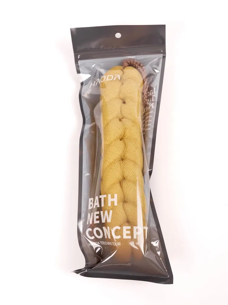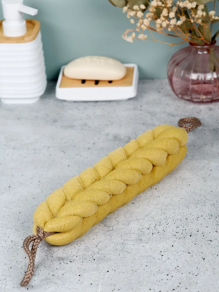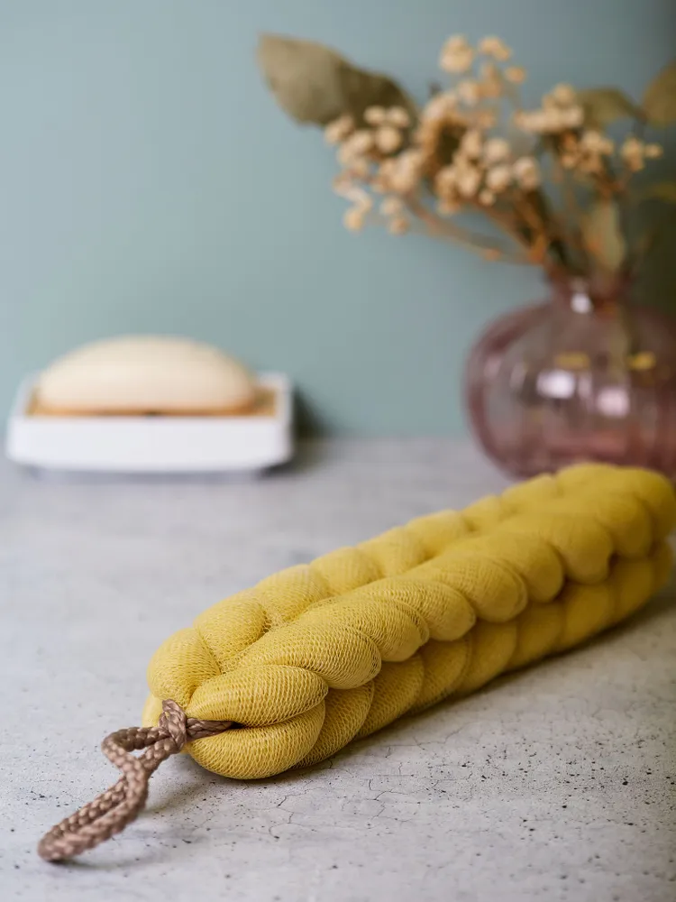 Мочалка изготовлена из натуральных материалов, которые мягко очищают кожу без раздражения. Она легко промывается и быстро сохнет, что делает её удобной в использовании и простой в уходе.