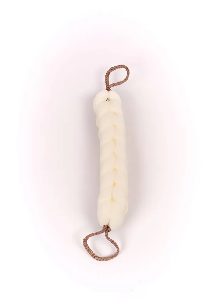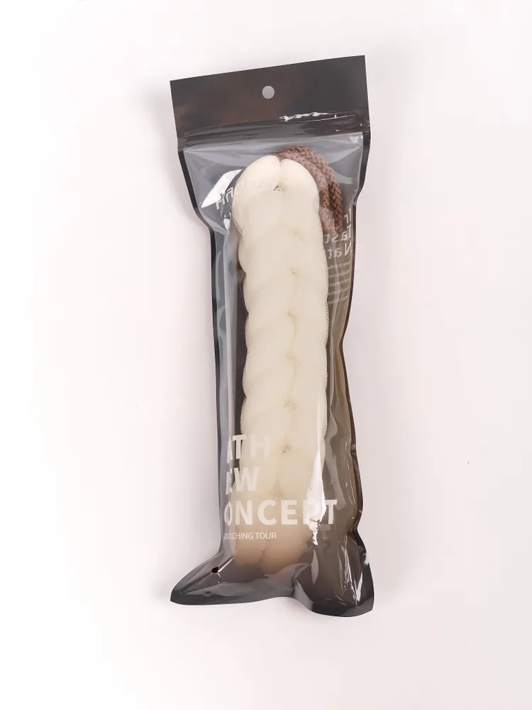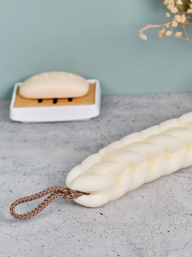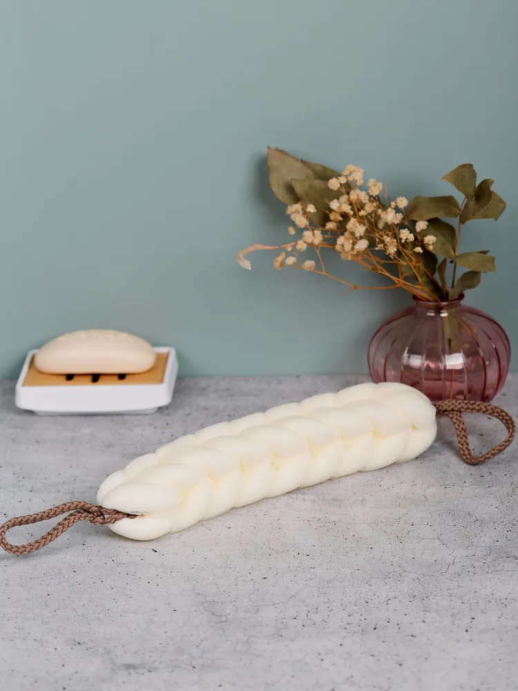 Мочалка имеет форму косы, которая позволяет легко очищать все участки тела без лишних усилий. Благодаря своей форме она также помогает массировать кожу, что способствует лучшему кровообращению и улучшает общее состояние кожи.