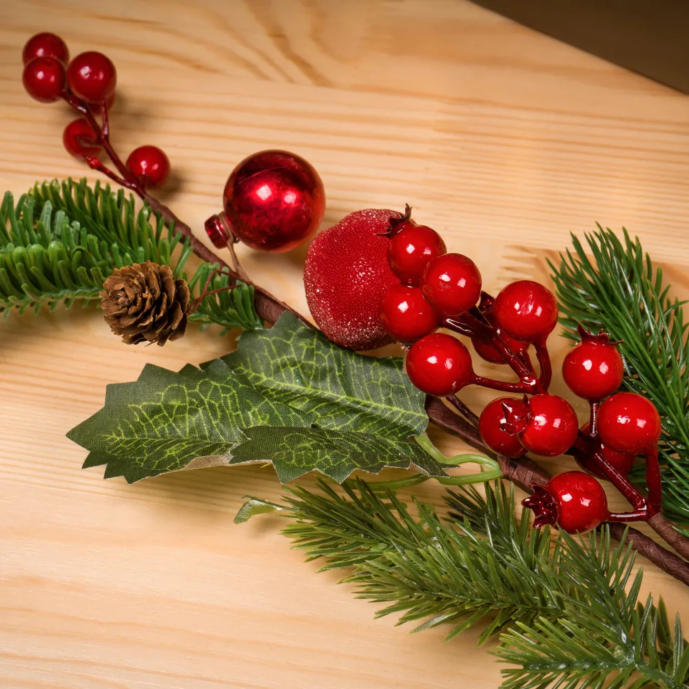 Новогодняя ветка отлично подойдет как для домашнего использования, так и для оформления различных мероприятий — от корпоративов до семейных праздников. Способы применения бесконечны: добавьте её в уже существующий декор или создайте что-то уникальное. Насыщенные цвета и детали позволят вам создать неожиданные акценты, которые не останутся незамеченными.