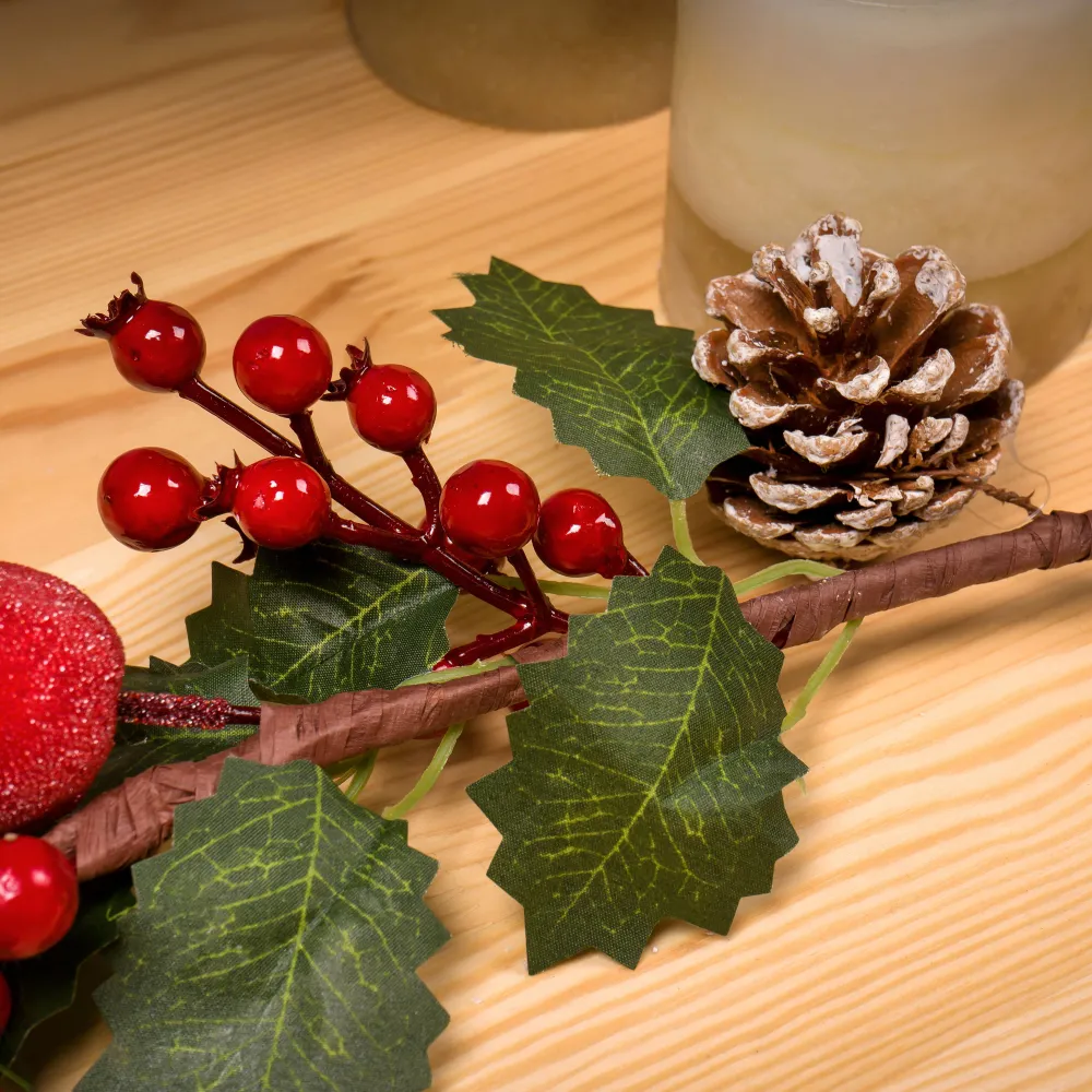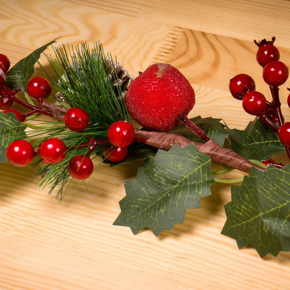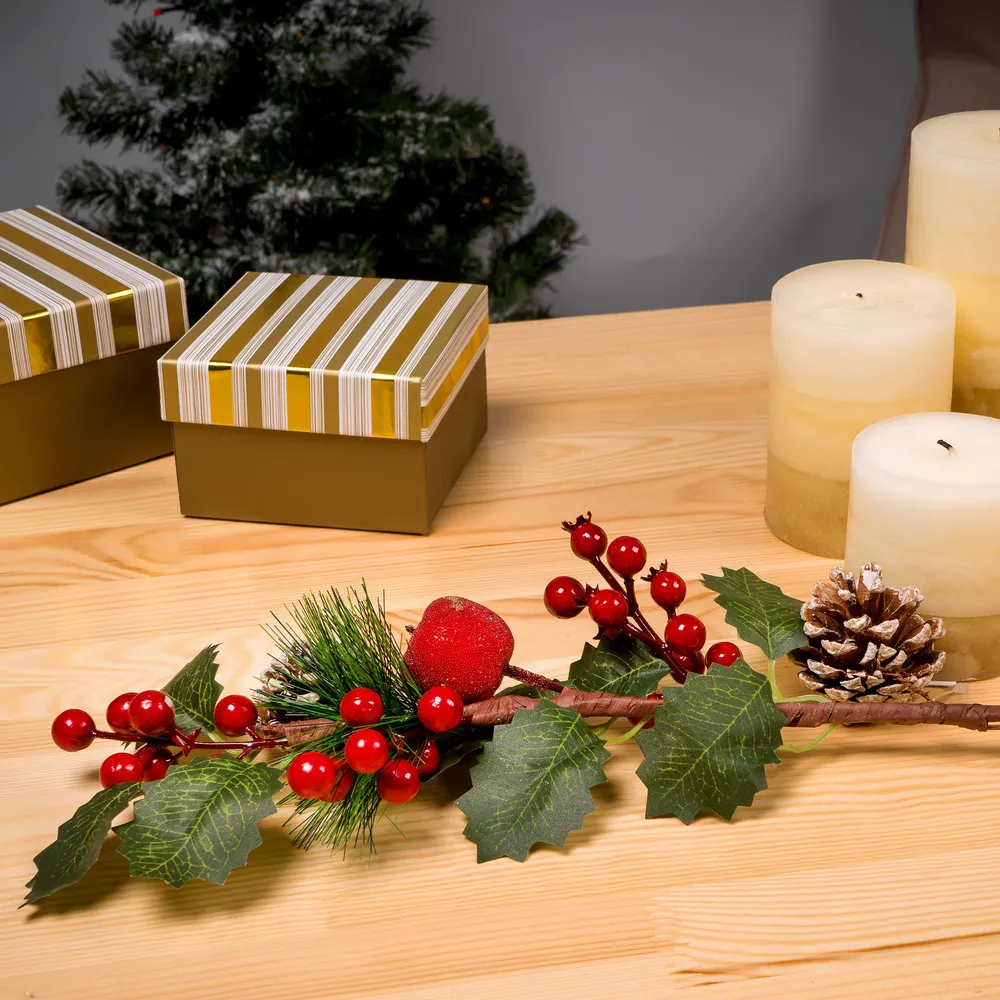 Ветка выполнена с тщательным вниманием к деталям и обладает ярким дизайном, который отлично передает дух зимних праздников. С ее помощью можно легко создать красивые гирлянды, украсить стол или добавить акценты в композиции. Благодаря универсальному стилю, эта новогодняя ветка идеально сочетается с другими декорациями, позволяя вам проявить свою креативность.