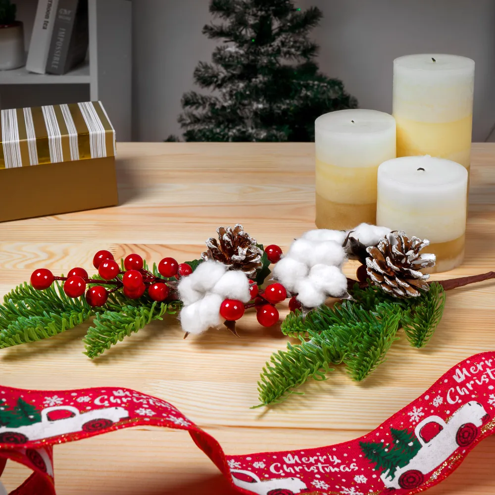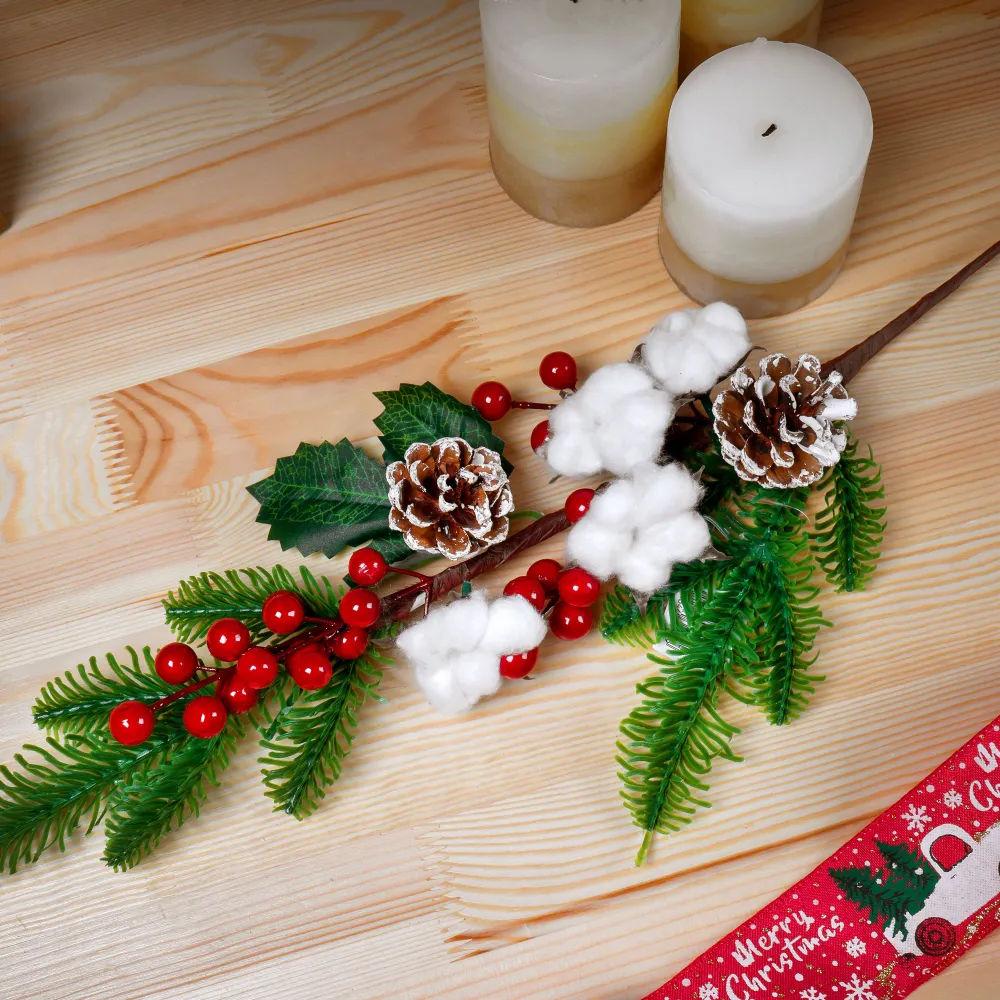 Эта новогодняя ветка подойдет для декорирования в самых разных стилях — от классического до современного. Вы можете использовать ее для создания оригинальных композиций на столе, украшения елки или оформления стен. Благодаря своим размерам, она легко впишется в любое праздничное оформление, добавив нотку уюта и стиля.
