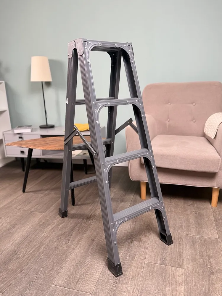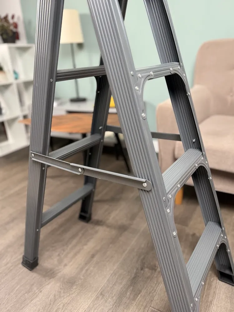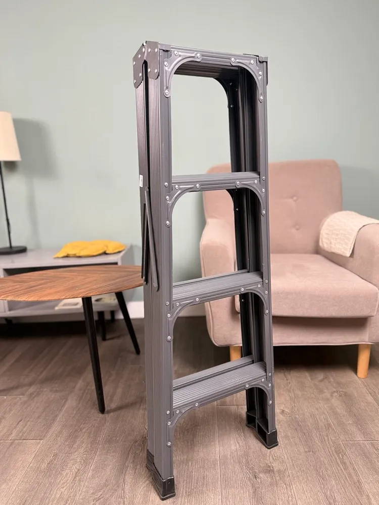 Лестница изготовлена из алюминия и ABS пластика, что делает ее прочной и долговечной. Максимальная рабочая нагрузка составляет 150 кг, что позволяет использовать ее для работы с различными материалами и оборудованием. Стремянка имеет две секции, которые можно регулировать по высоте в зависимости от потребностей пользователя.