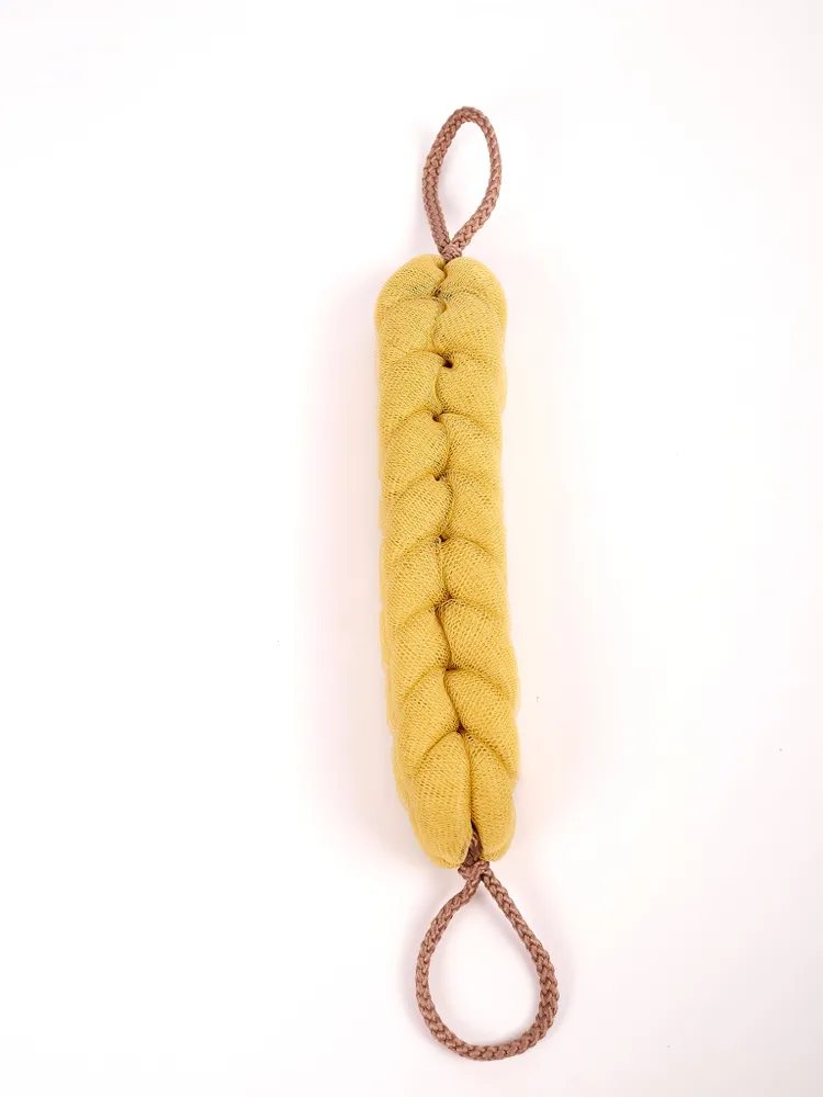 Мочалка изготовлена из натуральных материалов, которые мягко очищают кожу без раздражения. Она легко промывается и быстро сохнет, что делает её удобной в использовании и простой в уходе.