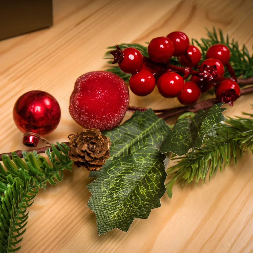 Новогодняя ветка отлично подойдет как для домашнего использования, так и для оформления различных мероприятий — от корпоративов до семейных праздников. Способы применения бесконечны: добавьте её в уже существующий декор или создайте что-то уникальное. Насыщенные цвета и детали позволят вам создать неожиданные акценты, которые не останутся незамеченными.