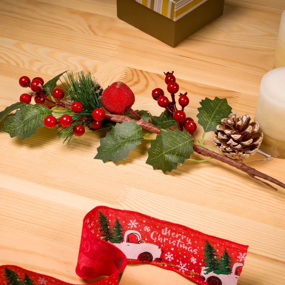 Ветка выполнена с тщательным вниманием к деталям и обладает ярким дизайном, который отлично передает дух зимних праздников. С ее помощью можно легко создать красивые гирлянды, украсить стол или добавить акценты в композиции. Благодаря универсальному стилю, эта новогодняя ветка идеально сочетается с другими декорациями, позволяя вам проявить свою креативность.