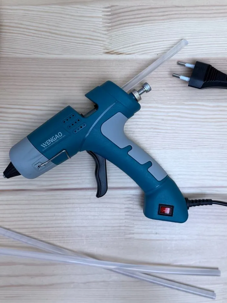 Клейовой пистолет имеет удобную ручку, которая обеспечивает комфортное управление при работе с клеем.